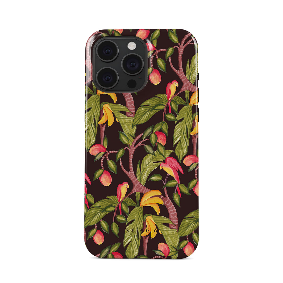 A lush botanical fantasy where ripe mangoes hang like forbidden fruit. Deep greens and juicy oranges pull you into a tropical escape. If this iPhone 15 Pro phone case design had a voice, it would purr.