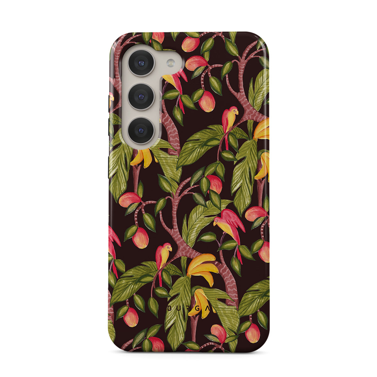 A lush botanical fantasy where ripe mangoes hang like forbidden fruit. Deep greens and juicy oranges pull you into a tropical escape. If this Samsung Galaxy S23 Plus phone case design had a voice, it would purr.