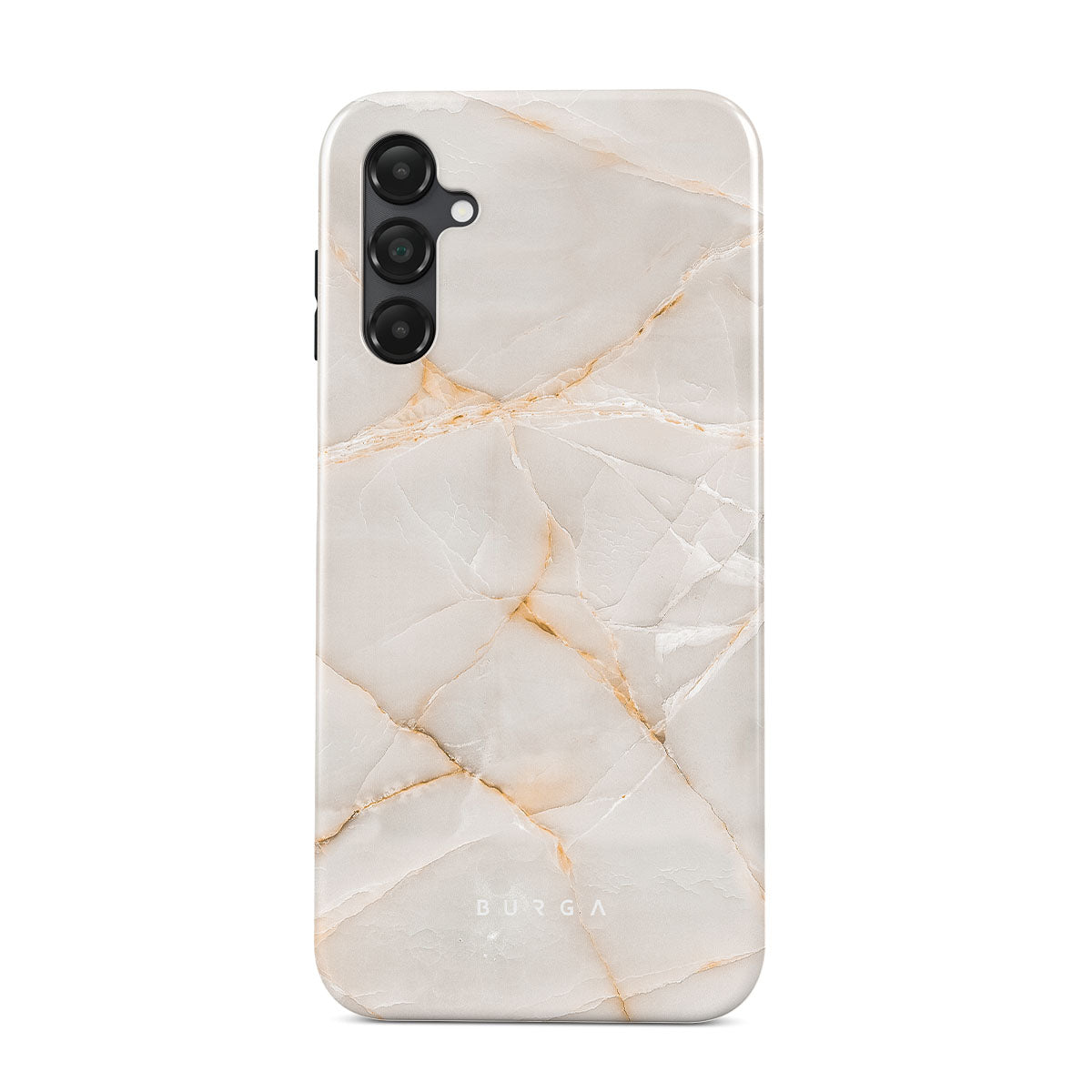 The Vanilla Sand Marble Samsung Galaxy A14 5G phone case cover features a marble design with creamy canvas showcasing beautiful golden hues. The soft-toned case will add a touch of luxury to the device while protecting it from dangerous falls.