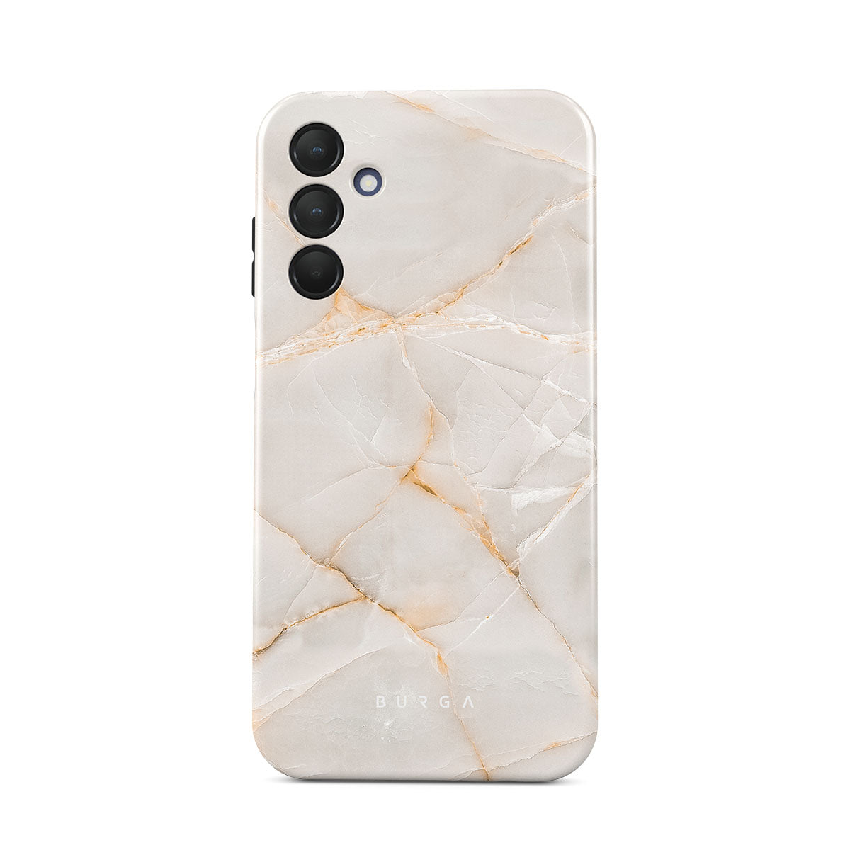 The Vanilla Sand Marble Samsung Galaxy A51 phone case cover features a marble design with creamy canvas showcasing beautiful golden hues. The soft-toned case will add a touch of luxury to the device while protecting it from dangerous falls.