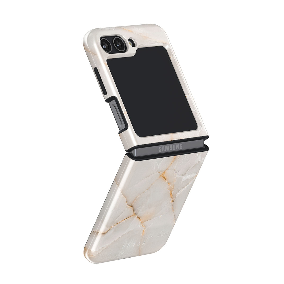 The Vanilla Sand Marble Samsung Galaxy Z Flip 5 phone case cover features a marble design with creamy canvas showcasing beautiful golden hues. The soft-toned case will add a touch of luxury to the device while protecting it from dangerous falls.