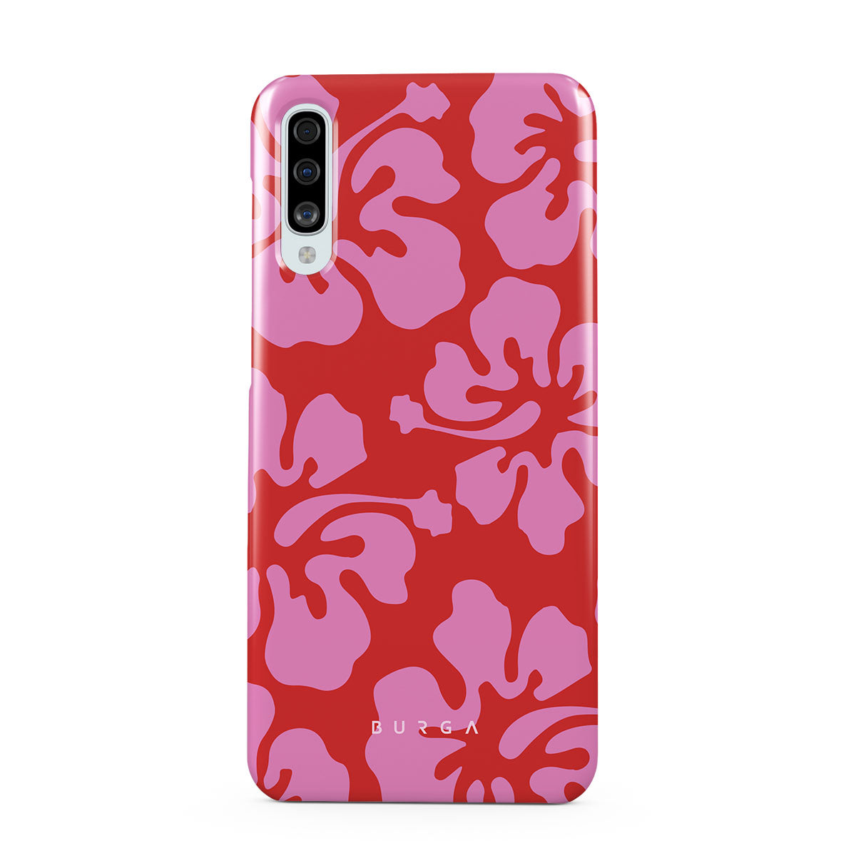 Dive into a sea of floral fantasy with Me Gustas Tu. Featuring oversized coral-toned blooms against a fiery backdrop, this Samsung Galaxy A50 phone case design captures the wild heart of tropical flowers—perfect for those who want to carry a touch of exotic flair.