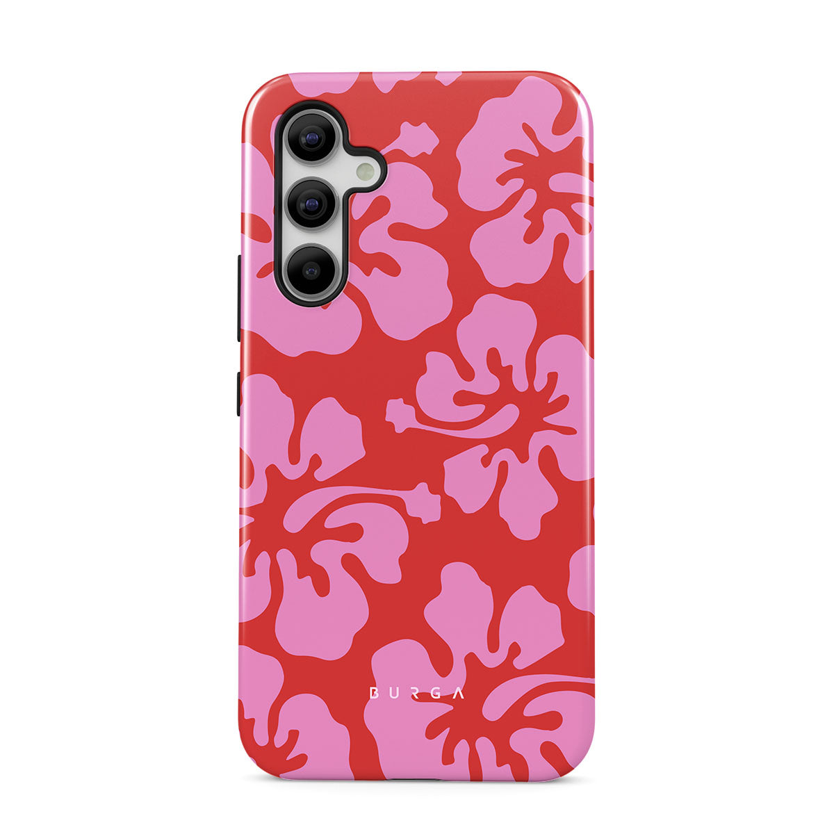 Dive into a sea of floral fantasy with Me Gustas Tu. Featuring oversized coral-toned blooms against a fiery backdrop, this Samsung Galaxy A54 phone case design captures the wild heart of tropical flowers—perfect for those who want to carry a touch of exotic flair.