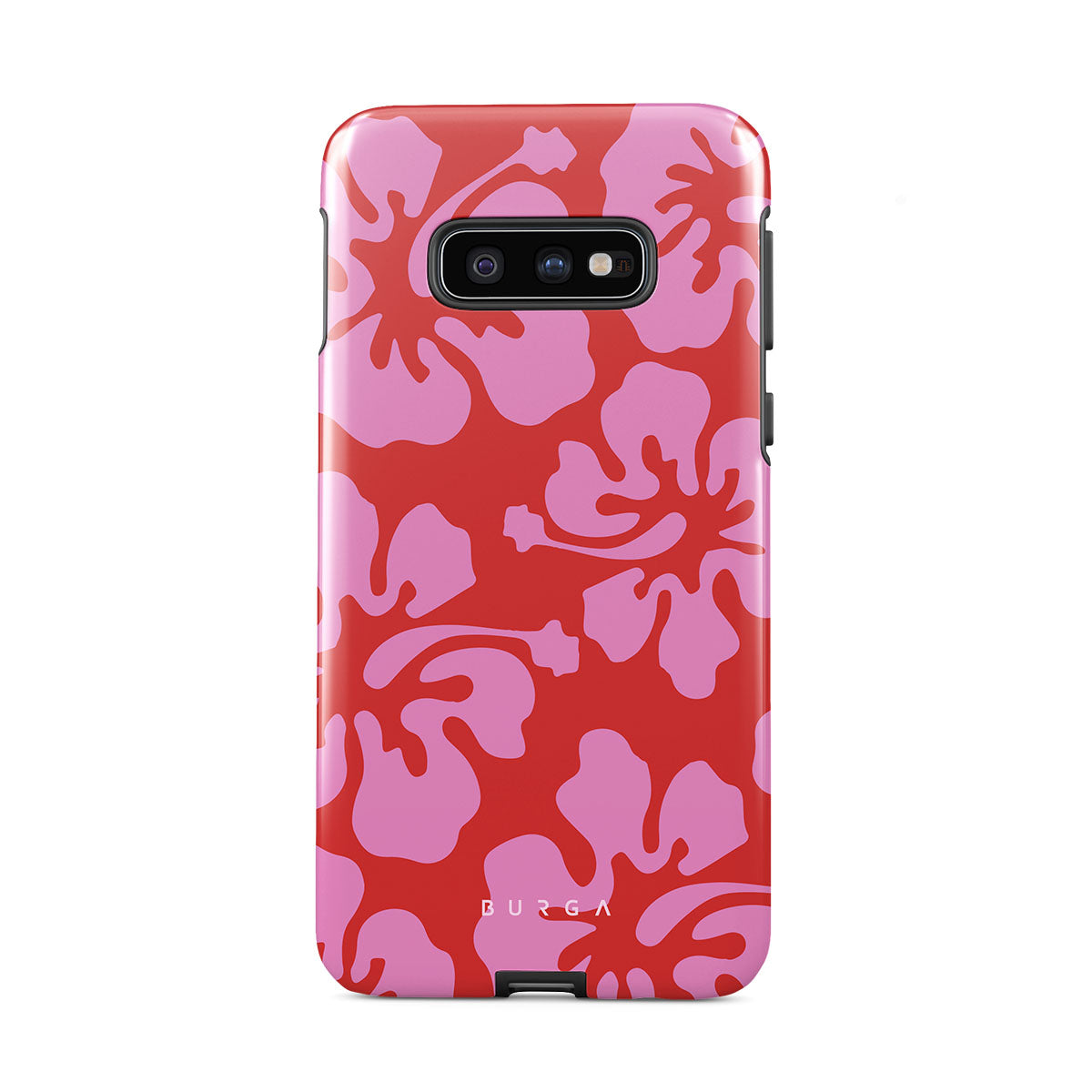 Dive into a sea of floral fantasy with Me Gustas Tu. Featuring oversized coral-toned blooms against a fiery backdrop, this Samsung Galaxy S10E phone case design captures the wild heart of tropical flowers—perfect for those who want to carry a touch of exotic flair.