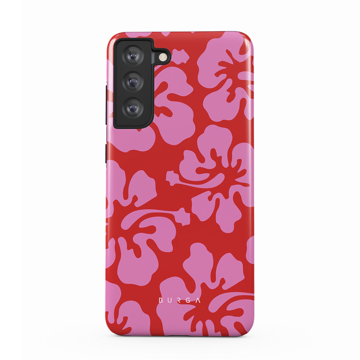 Dive into a sea of floral fantasy with Me Gustas Tu. Featuring oversized coral-toned blooms against a fiery backdrop, this Samsung Galaxy S21 FE phone case design captures the wild heart of tropical flowers—perfect for those who want to carry a touch of exotic flair.