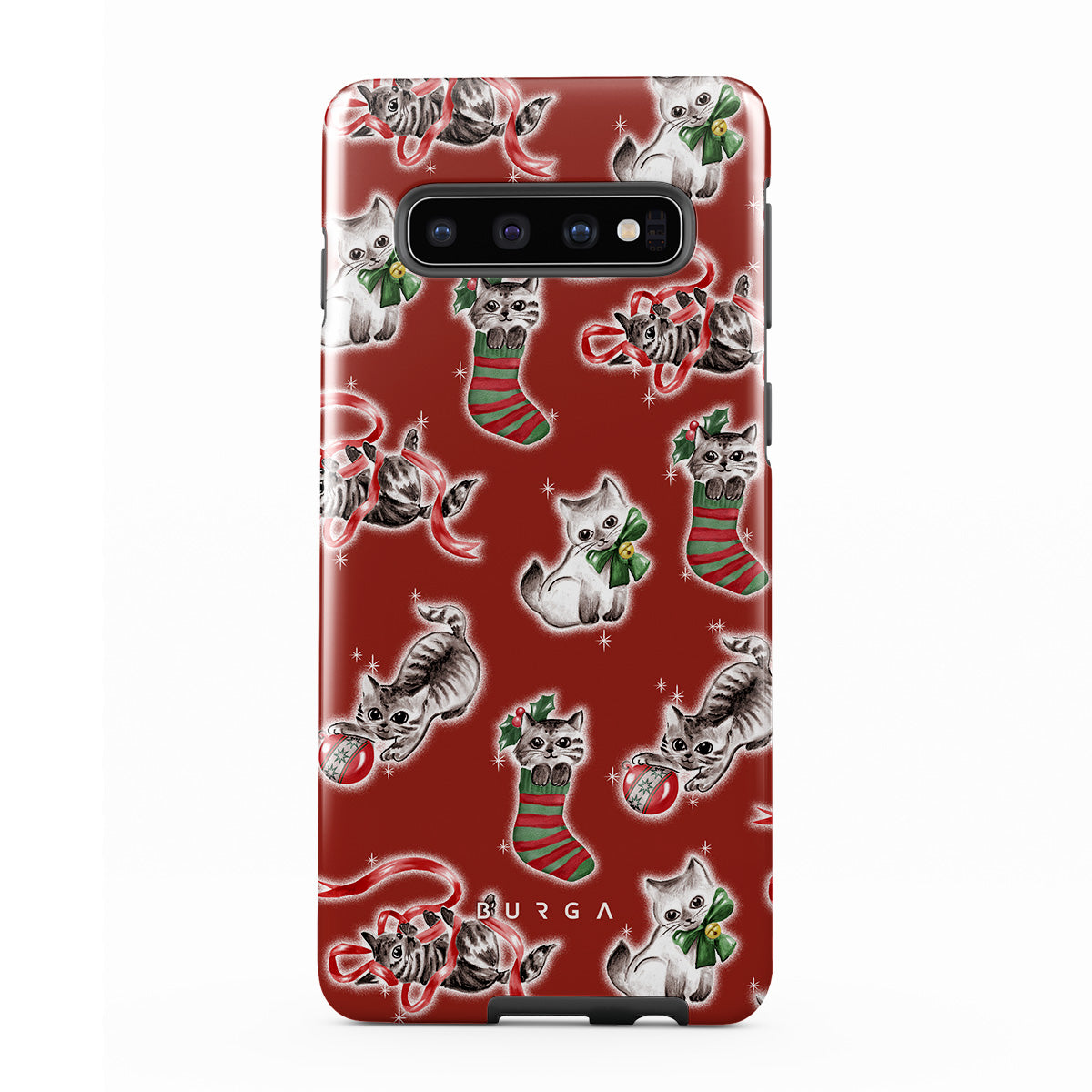 Cats destroying your Christmas decorations since forever. This Samsung Galaxy S10 4G phone case design honors the tradition.
