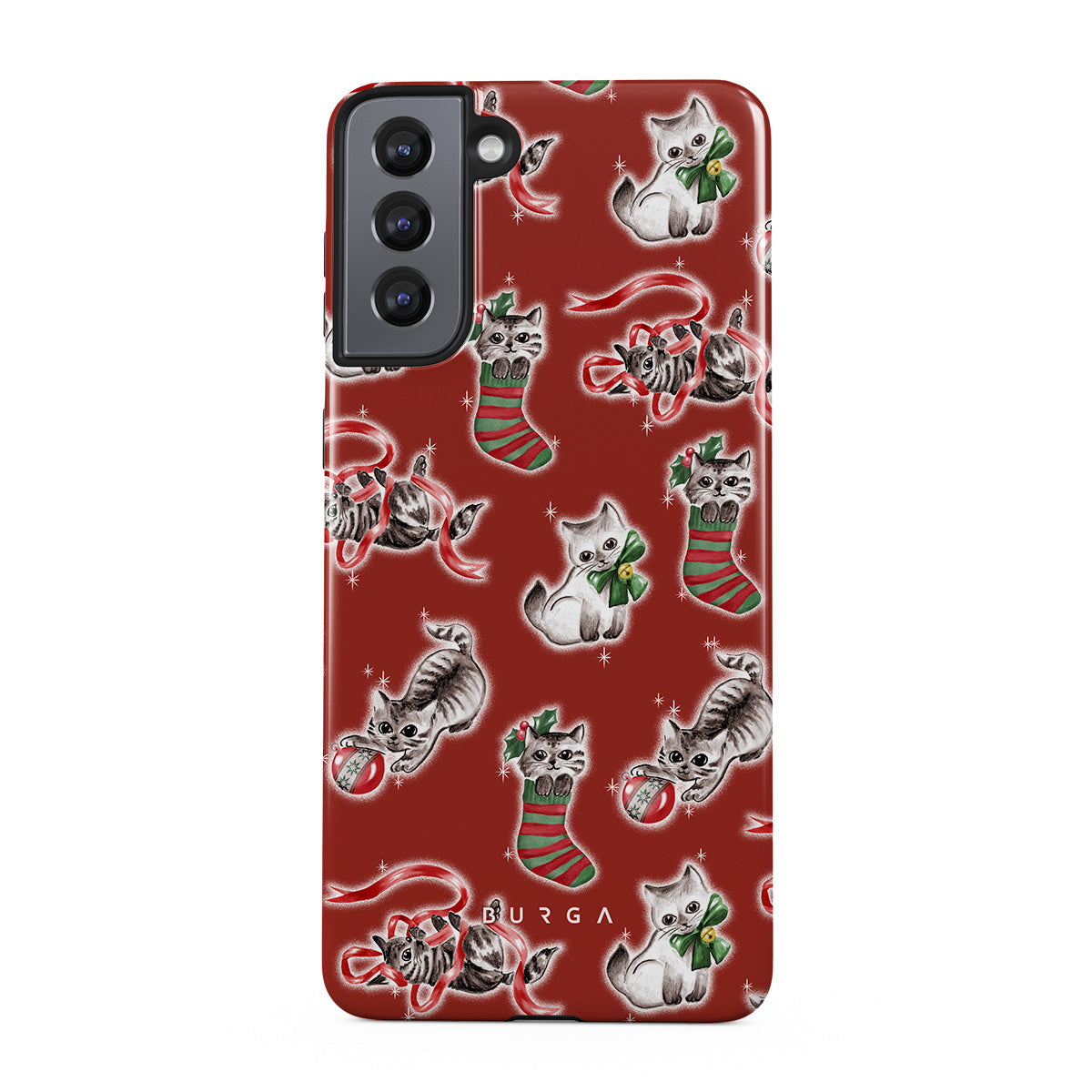 Cats destroying your Christmas decorations since forever. This Samsung Galaxy S21 phone case design honors the tradition.