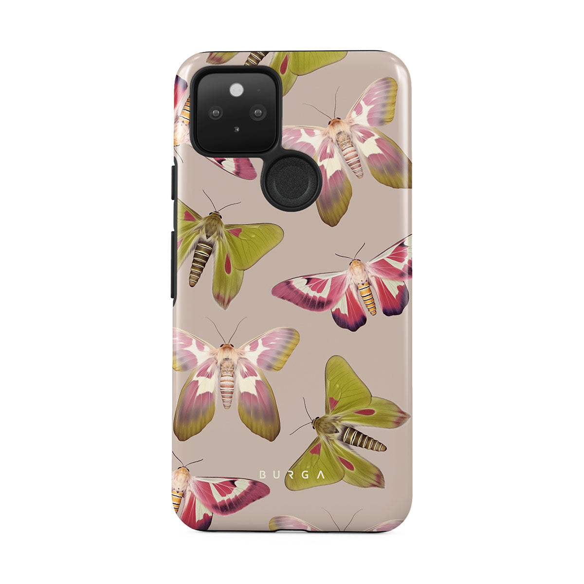 A tapestry of muted-toned moths — their wing patterns echoing tales of transformation and resilience found in nature's delicate beings. These moths, wings wide, serve as silent mentors, teaching us that every phase of life and change holds its own magic and mystery. Discover our Metamorphosis Google Pixel 5 phone casedesign.