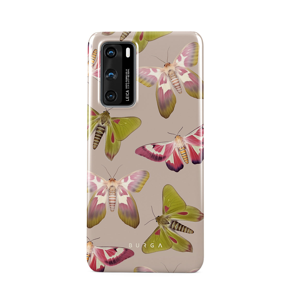A tapestry of muted-toned moths — their wing patterns echoing tales of transformation and resilience found in nature's delicate beings. These moths, wings wide, serve as silent mentors, teaching us that every phase of life and change holds its own magic and mystery. Discover our Metamorphosis Huawei P40 phone casedesign.