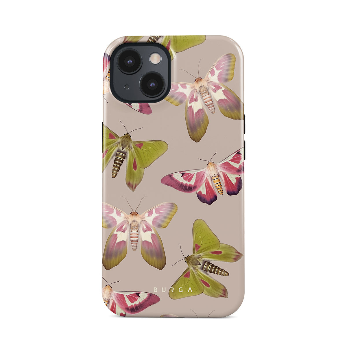 A tapestry of muted-toned moths — their wing patterns echoing tales of transformation and resilience found in nature's delicate beings. These moths, wings wide, serve as silent mentors, teaching us that every phase of life and change holds its own magic and mystery. Discover our Metamorphosis iPhone 15 phone casedesign.