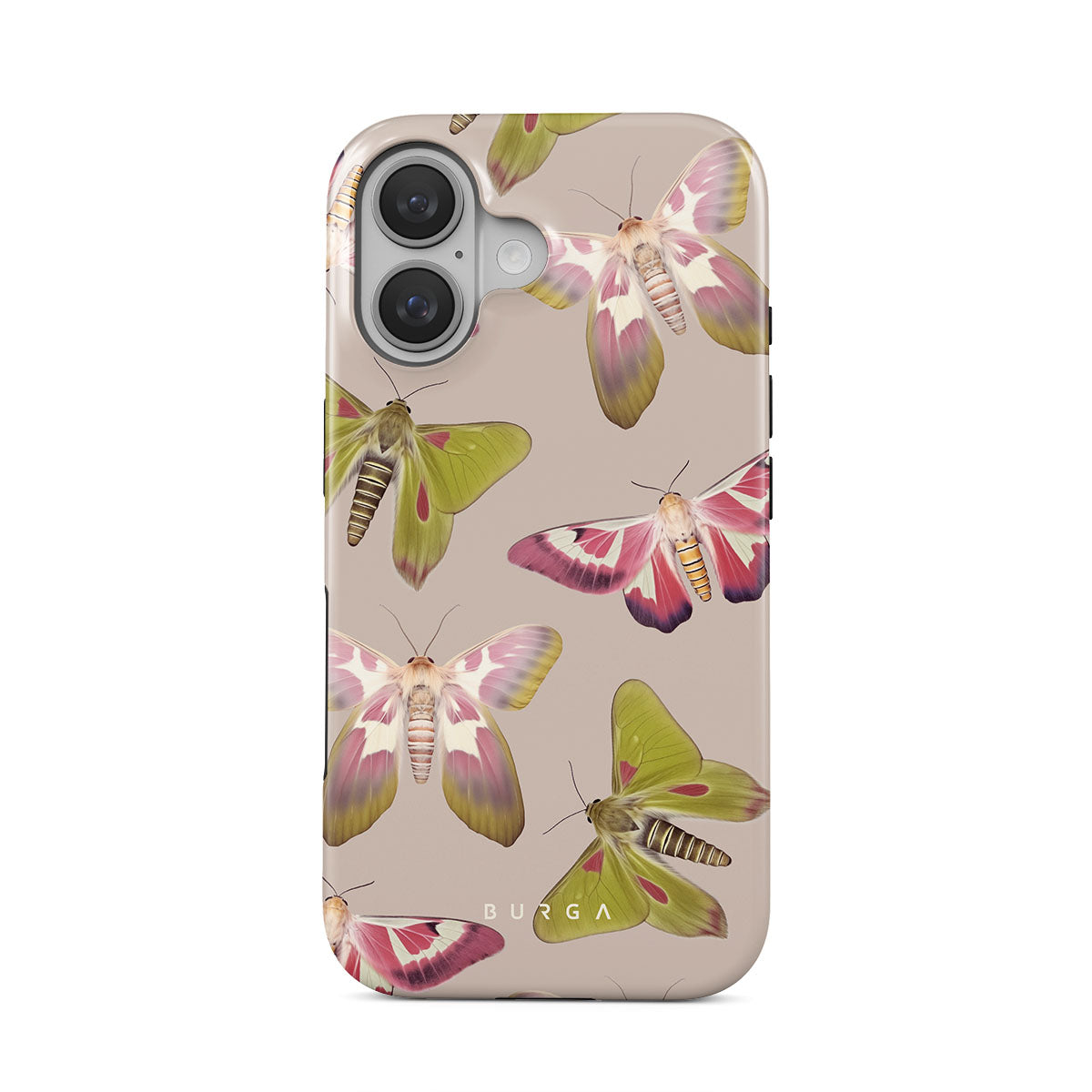 A tapestry of muted-toned moths — their wing patterns echoing tales of transformation and resilience found in nature's delicate beings. These moths, wings wide, serve as silent mentors, teaching us that every phase of life and change holds its own magic and mystery. Discover our Metamorphosis iPhone 16 phone casedesign.