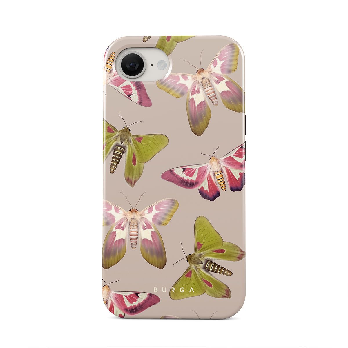 A tapestry of muted-toned moths — their wing patterns echoing tales of transformation and resilience found in nature's delicate beings. These moths, wings wide, serve as silent mentors, teaching us that every phase of life and change holds its own magic and mystery. Discover our Metamorphosis iPhone 16e phone casedesign.