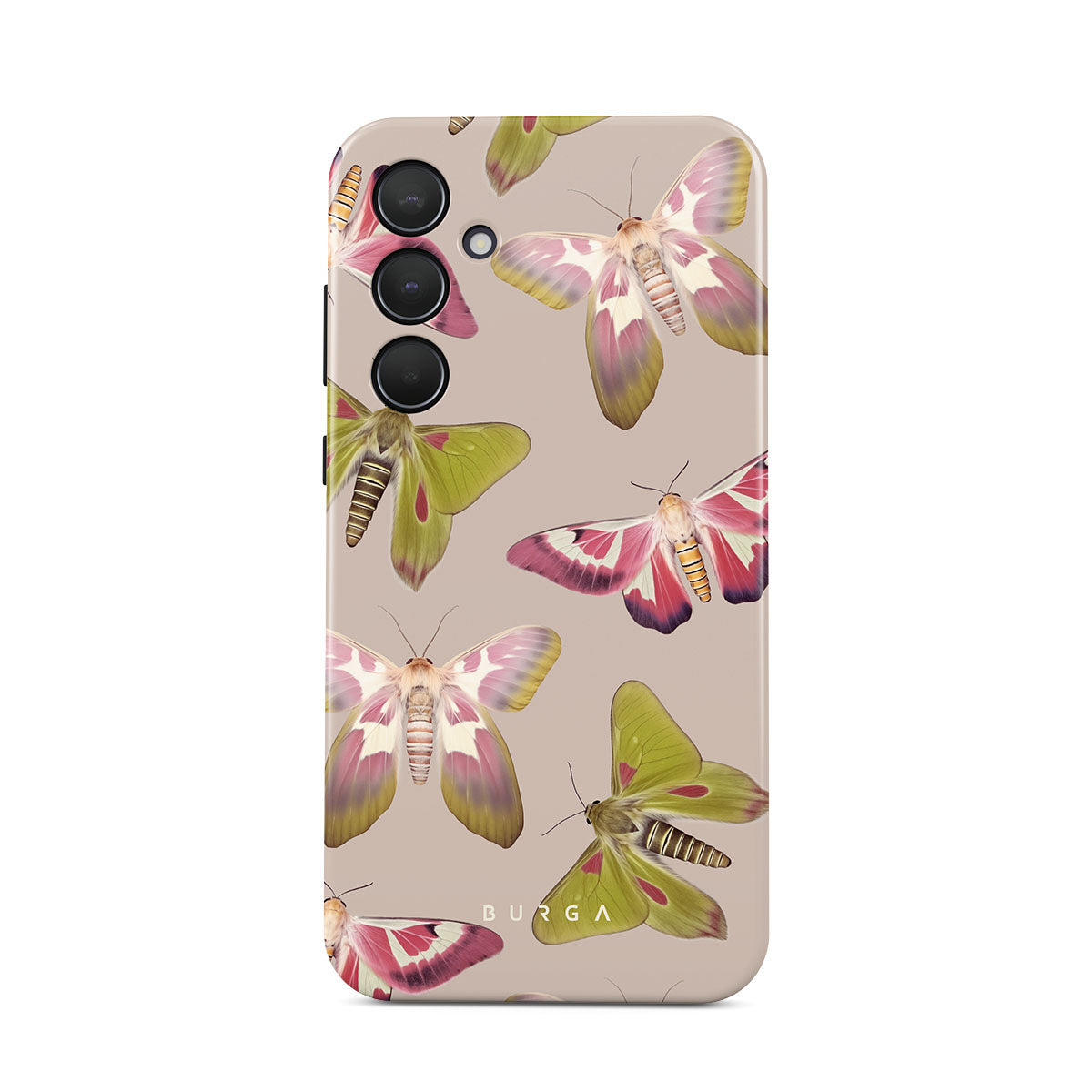 A tapestry of muted-toned moths — their wing patterns echoing tales of transformation and resilience found in nature's delicate beings. These moths, wings wide, serve as silent mentors, teaching us that every phase of life and change holds its own magic and mystery. Discover our Metamorphosis Samsung Galaxy A35 phone casedesign.
