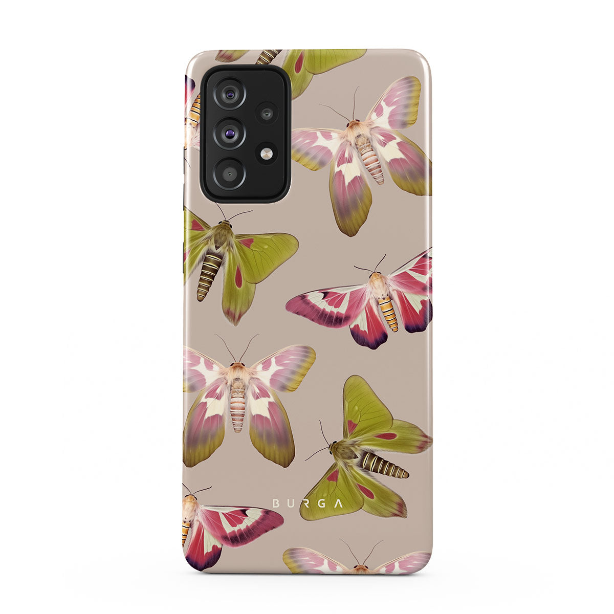A tapestry of muted-toned moths — their wing patterns echoing tales of transformation and resilience found in nature's delicate beings. These moths, wings wide, serve as silent mentors, teaching us that every phase of life and change holds its own magic and mystery. Discover our Metamorphosis Samsung Galaxy A52 / A52S 4G / 5G phone casedesign.