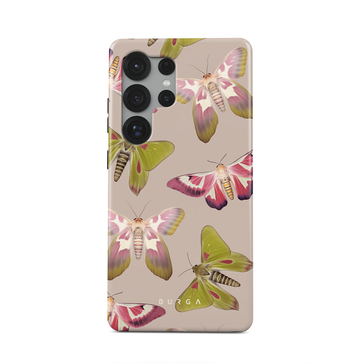 A tapestry of muted-toned moths — their wing patterns echoing tales of transformation and resilience found in nature's delicate beings. These moths, wings wide, serve as silent mentors, teaching us that every phase of life and change holds its own magic and mystery. Discover our Metamorphosis Samsung Galaxy S25 Ultra phone casedesign.