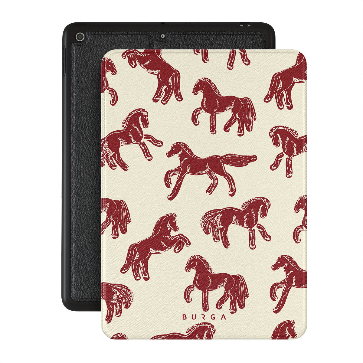 It's time to unleash your wild side with the Mustang design. Bold red horses gallop across a nude background, capturing the spirit of untamed adventure. This iPad 10.2 (9th/8th/7th Gen) folio case is perfect for the free-spirited souls ready to ride into the unknown.