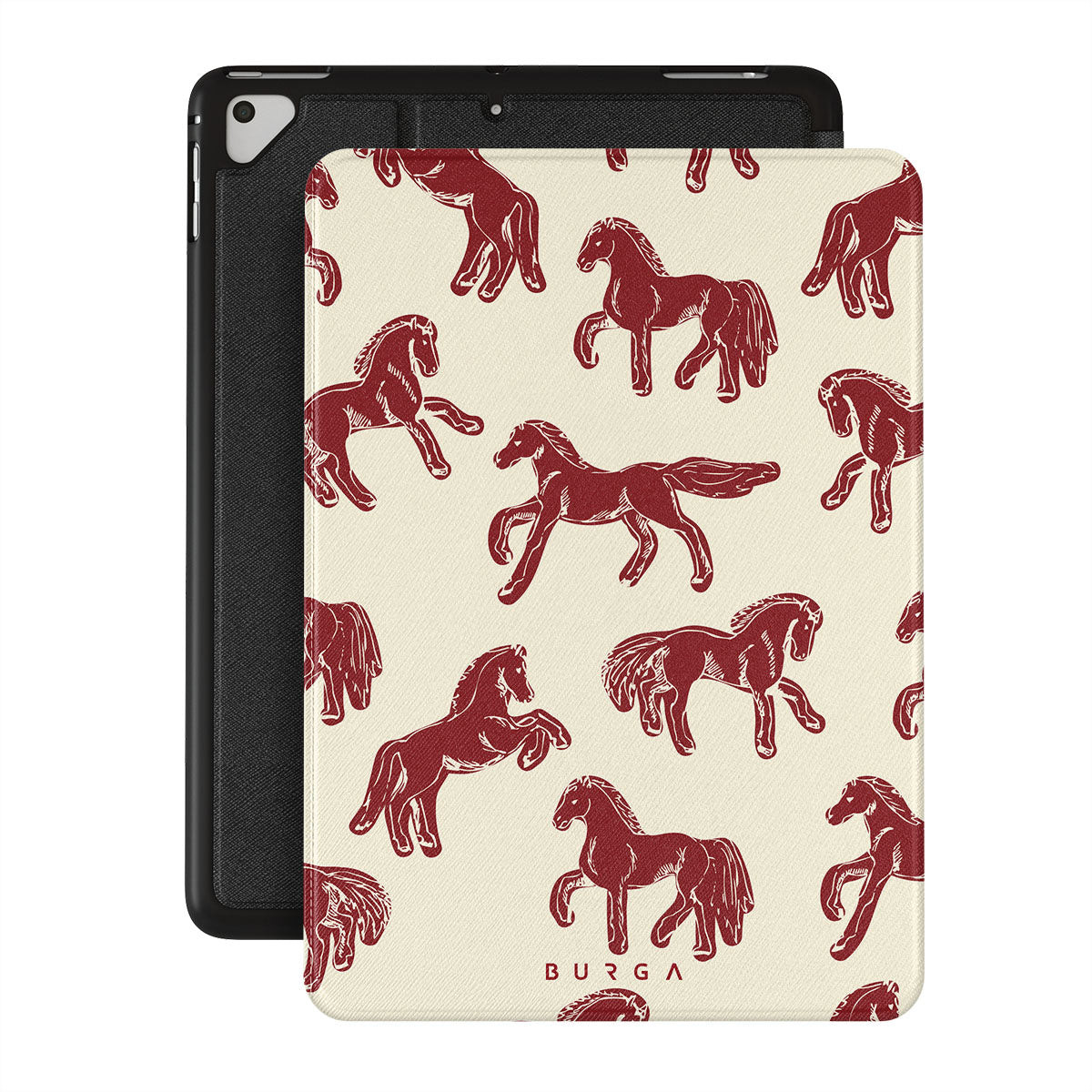 It's time to unleash your wild side with the Mustang design. Bold red horses gallop across a nude background, capturing the spirit of untamed adventure. This iPad 9.7 (6th/5th Gen) folio case is perfect for the free-spirited souls ready to ride into the unknown.