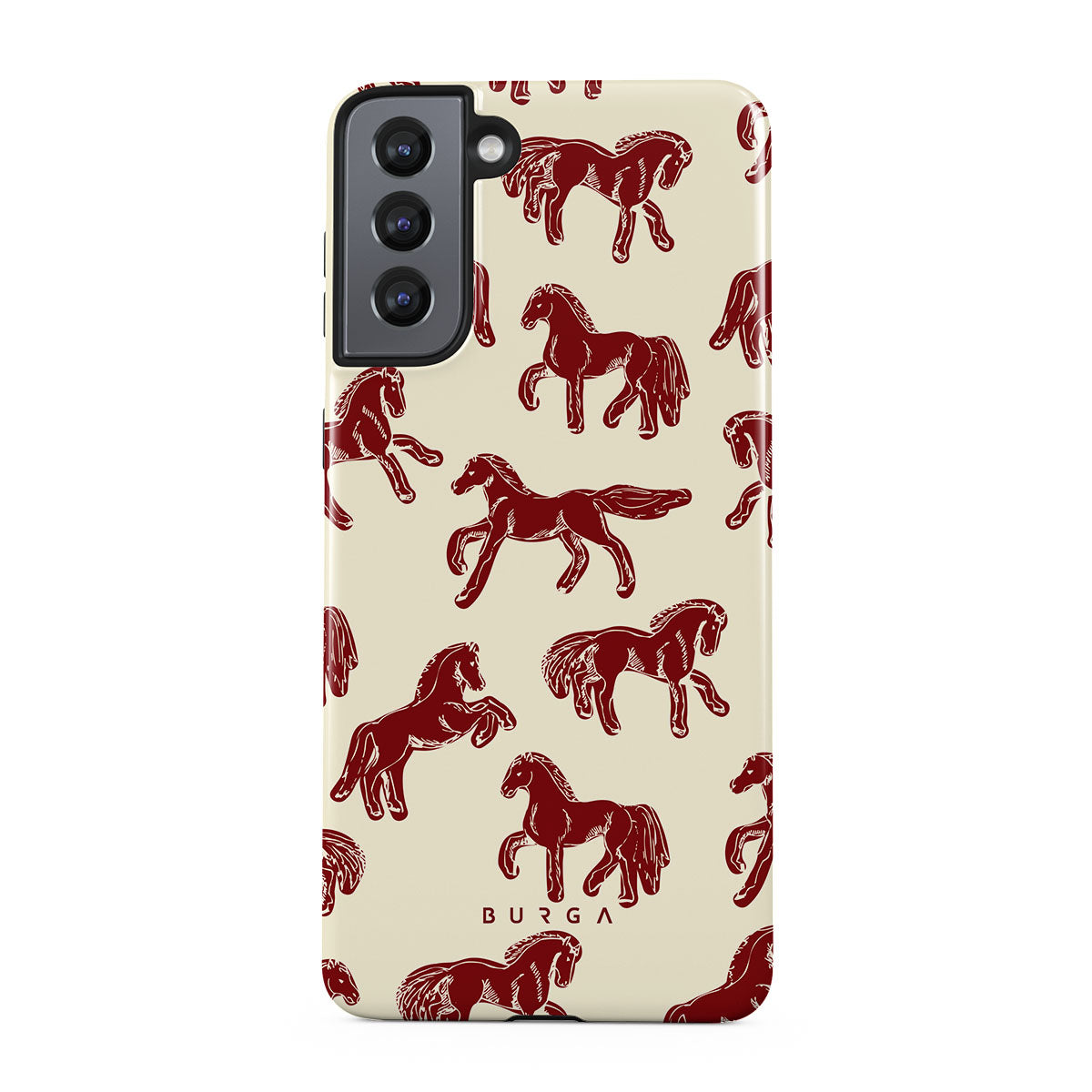 It's time to unleash your wild side with the Mustang design. Bold red horses gallop across a nude background, capturing the spirit of untamed adventure. This Samsung Galaxy S21 phone case is perfect for the free-spirited souls ready to ride into the unknown.