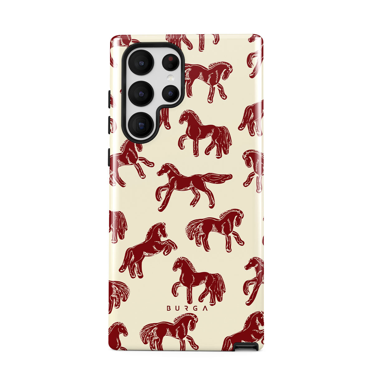 It's time to unleash your wild side with the Mustang design. Bold red horses gallop across a nude background, capturing the spirit of untamed adventure. This Samsung Galaxy S22 Ultra phone case is perfect for the free-spirited souls ready to ride into the unknown.