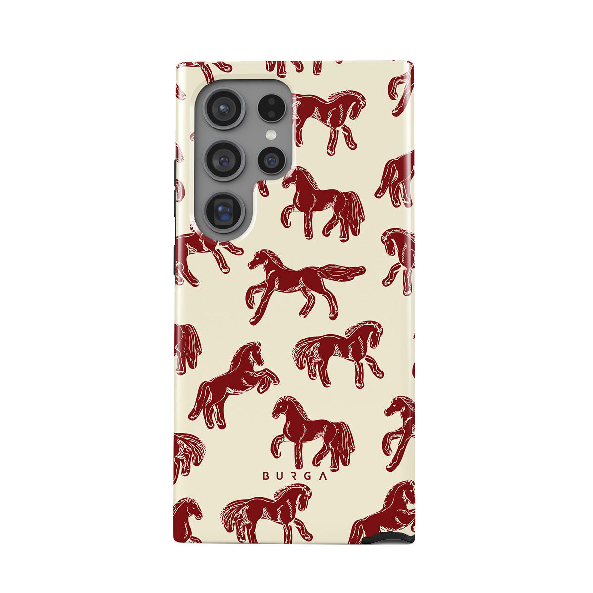 It's time to unleash your wild side with the Mustang design. Bold red horses gallop across a nude background, capturing the spirit of untamed adventure. This Samsung Galaxy S24 Ultra phone case is perfect for the free-spirited souls ready to ride into the unknown.