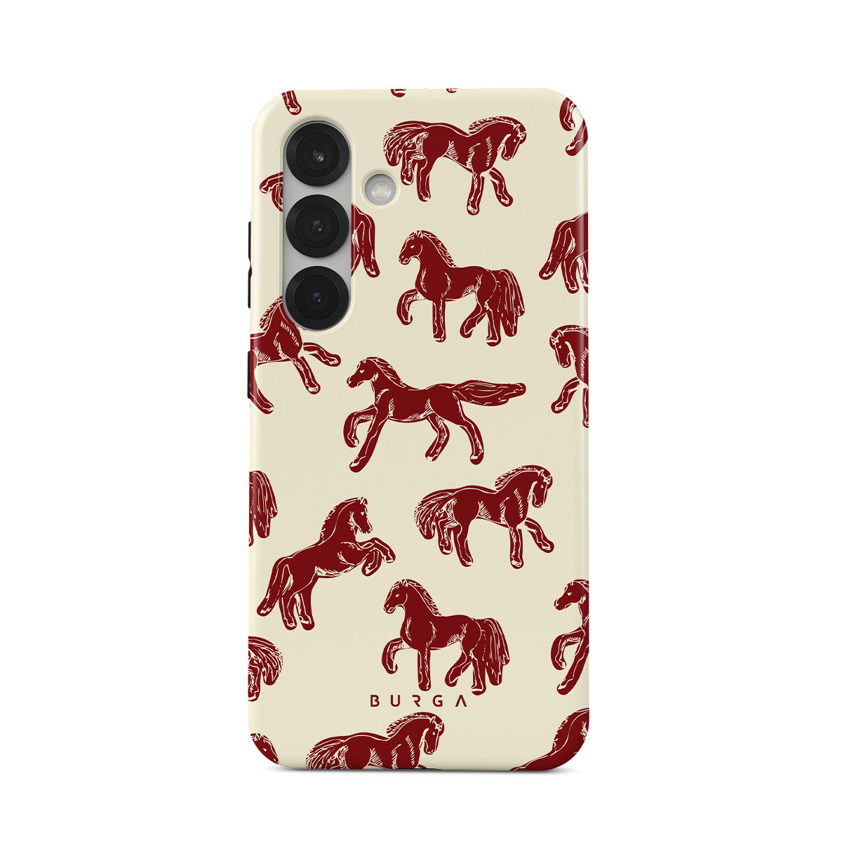 It's time to unleash your wild side with the Mustang design. Bold red horses gallop across a nude background, capturing the spirit of untamed adventure. This Samsung Galaxy S25 Plus phone case is perfect for the free-spirited souls ready to ride into the unknown.