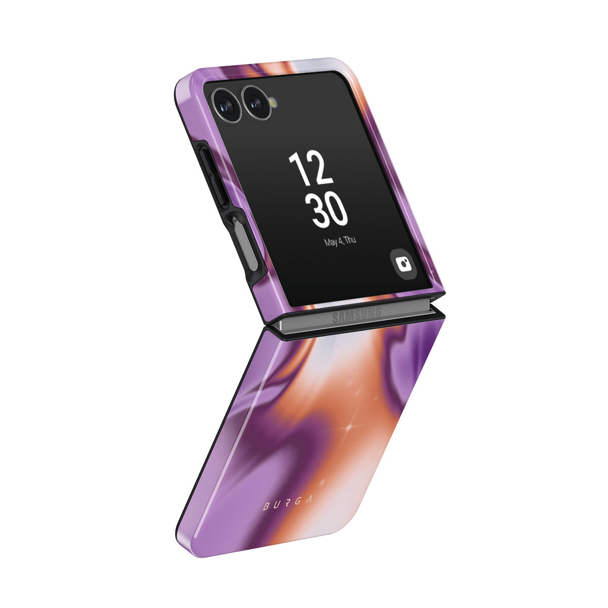 Dip into the Nebula, where runway glamour collides with cosmic seduction. Purple flames play upon a bright canvas, showcasing the fiery dance of distant galaxies. Our Nebula Samsung Galaxy Z Flip 7 phone case is a piece of the universe, sparking conversations with its vibrant, otherworldly beauty.
