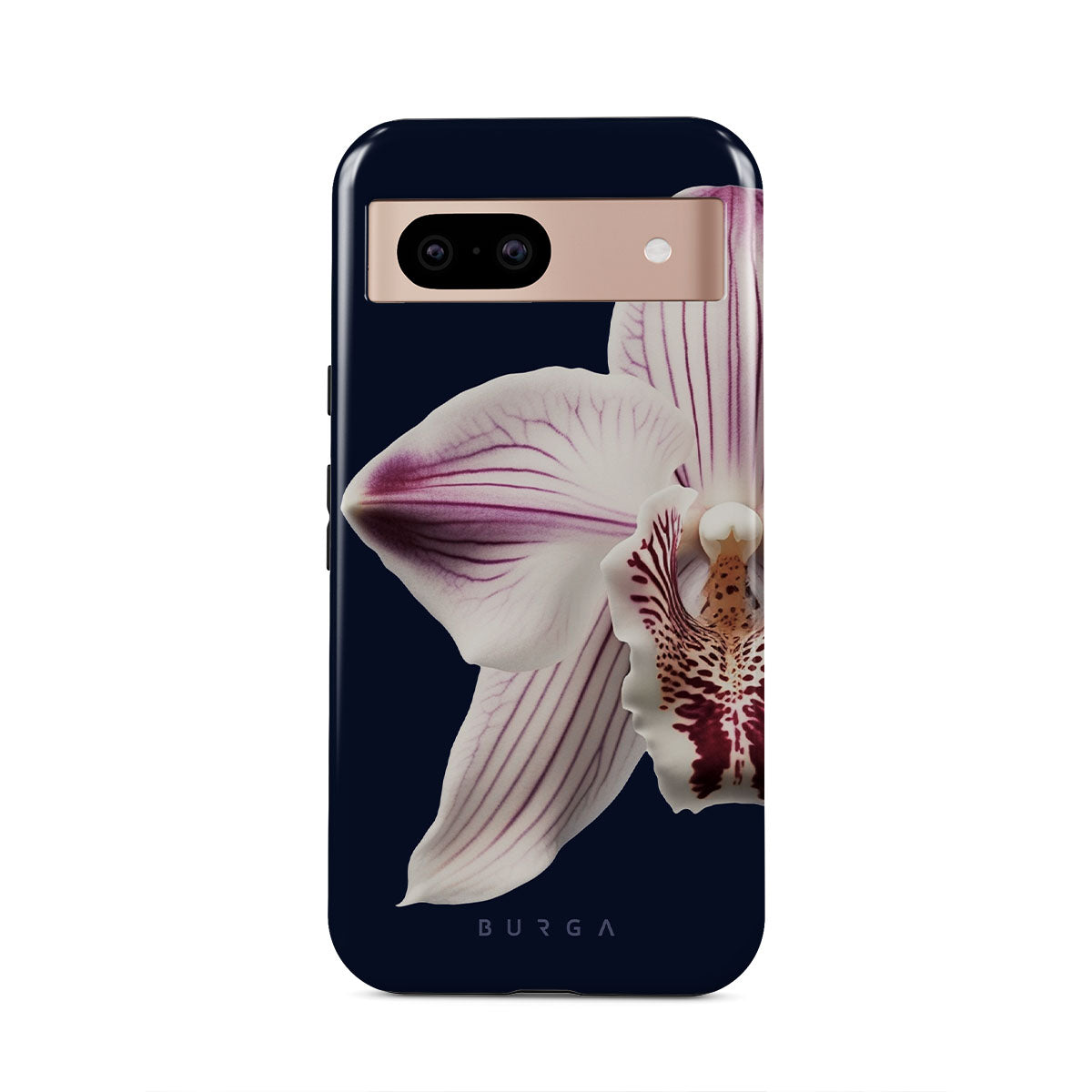 The white orchid blooms boldly upon a night sky blue, a beacon of clarity in the darkness. Our Nectar Google Pixel 8a phone case design speaks to the soul's desire to find light within, to illuminate the hidden paths of self-discovery that only reveal themselves under the cloak of introspection.