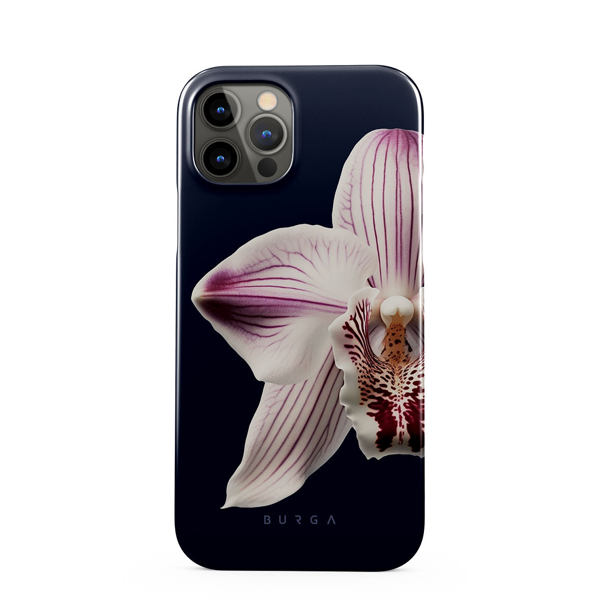 The white orchid blooms boldly upon a night sky blue, a beacon of clarity in the darkness. Our Nectar iPhone 12 Pro Max phone case design speaks to the soul's desire to find light within, to illuminate the hidden paths of self-discovery that only reveal themselves under the cloak of introspection.