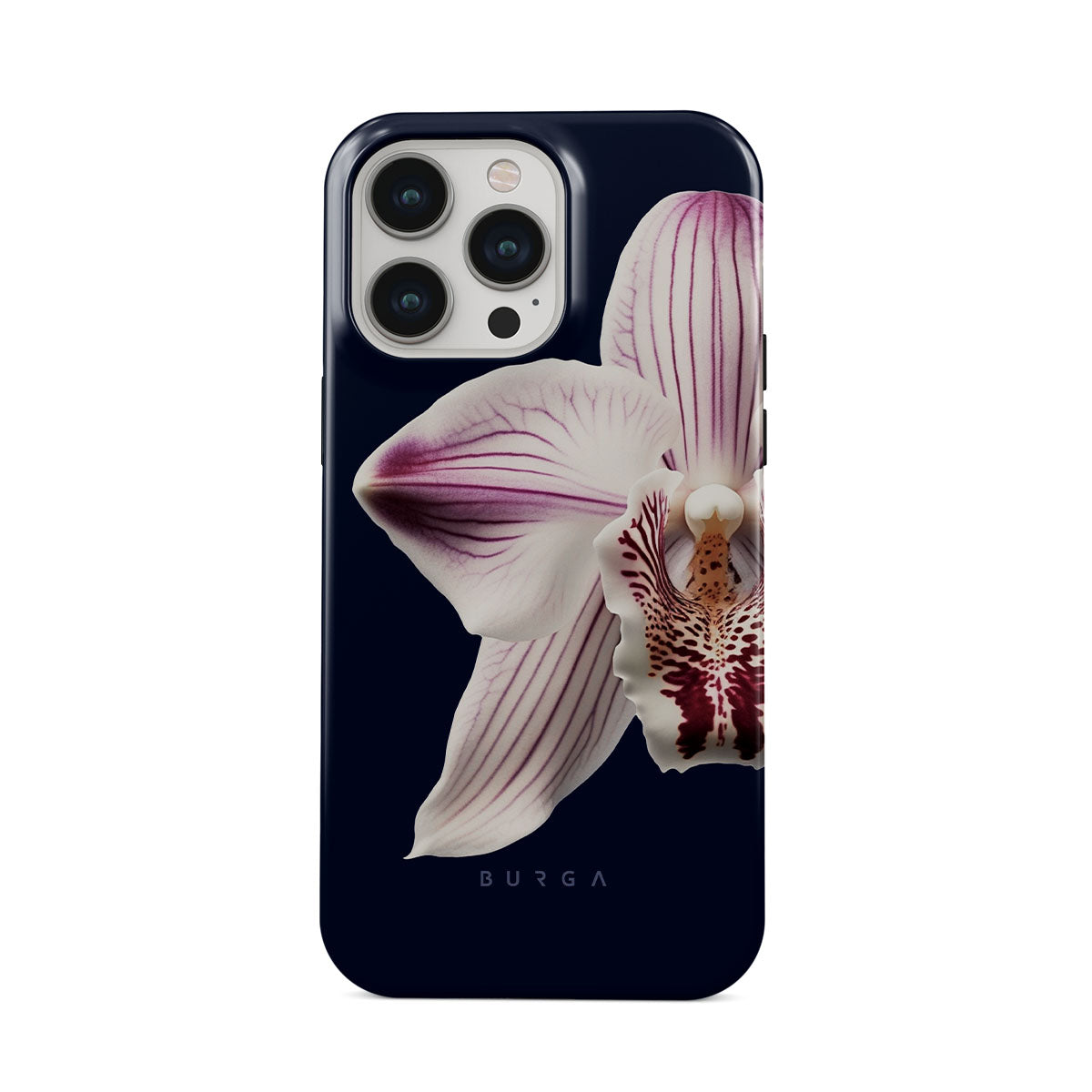 The white orchid blooms boldly upon a night sky blue, a beacon of clarity in the darkness. Our Nectar iPhone 14 Pro phone case design speaks to the soul's desire to find light within, to illuminate the hidden paths of self-discovery that only reveal themselves under the cloak of introspection.