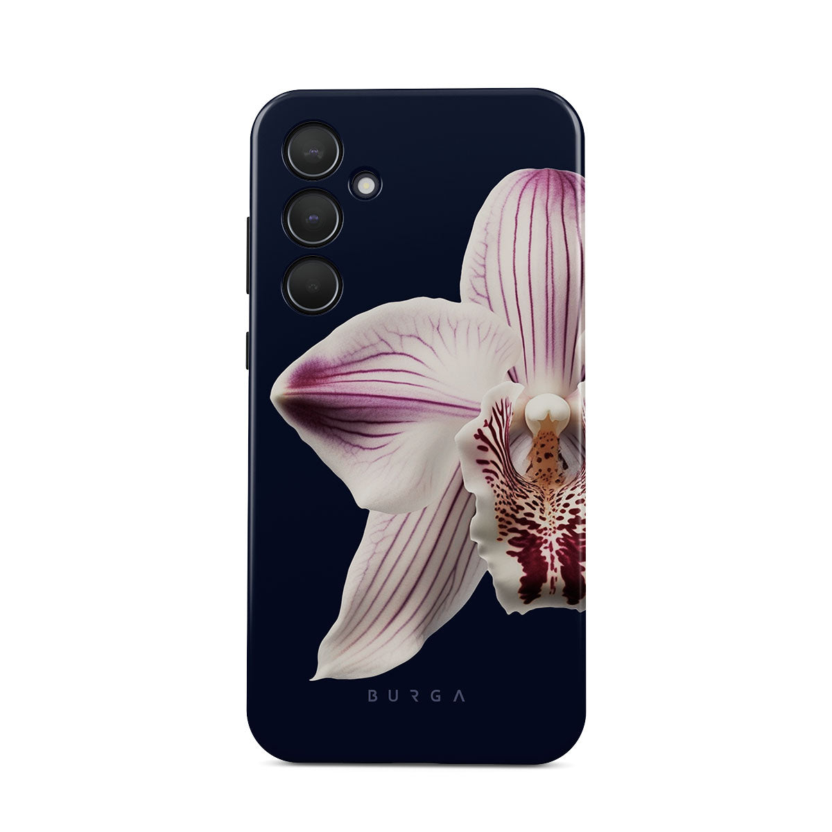 The white orchid blooms boldly upon a night sky blue, a beacon of clarity in the darkness. Our Nectar Samsung Galaxy A35 phone case design speaks to the soul's desire to find light within, to illuminate the hidden paths of self-discovery that only reveal themselves under the cloak of introspection.