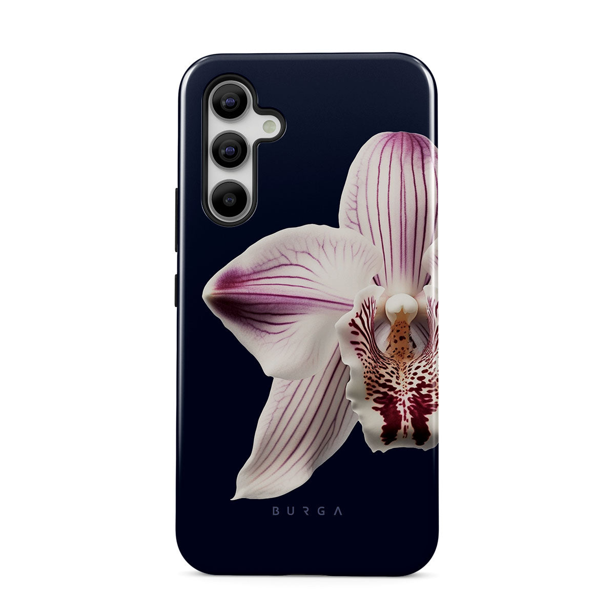 The white orchid blooms boldly upon a night sky blue, a beacon of clarity in the darkness. Our Nectar Samsung Galaxy A54 phone case design speaks to the soul's desire to find light within, to illuminate the hidden paths of self-discovery that only reveal themselves under the cloak of introspection.
