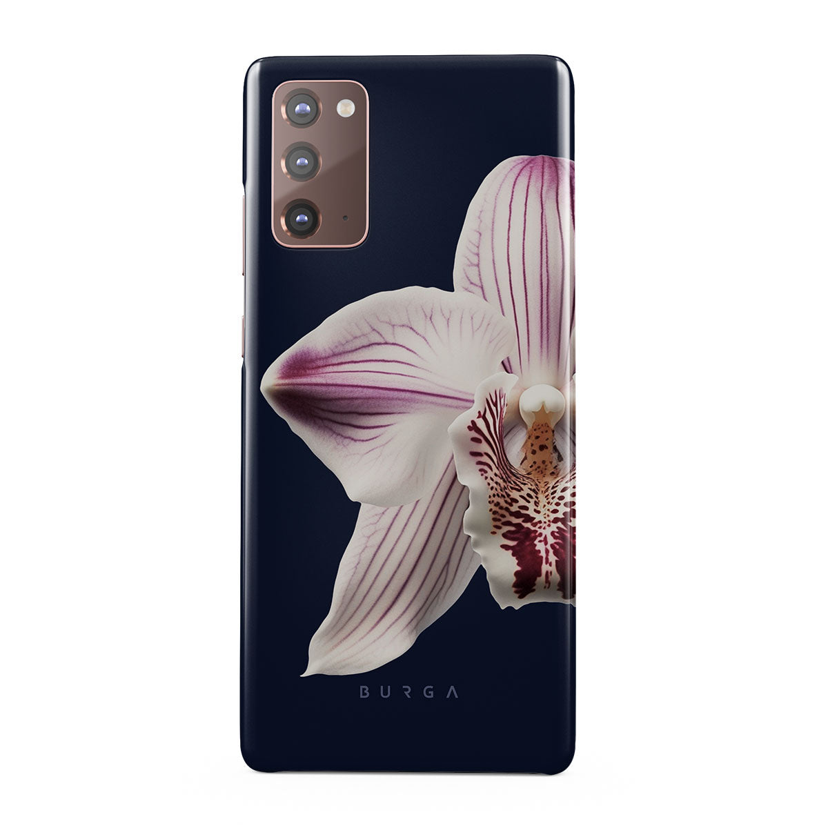 The white orchid blooms boldly upon a night sky blue, a beacon of clarity in the darkness. Our Nectar Samsung Galaxy Note 20 4G / 5G phone case design speaks to the soul's desire to find light within, to illuminate the hidden paths of self-discovery that only reveal themselves under the cloak of introspection.