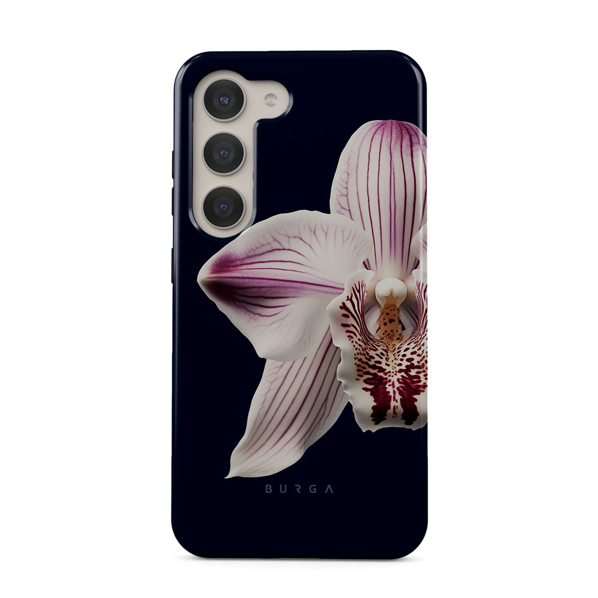 The white orchid blooms boldly upon a night sky blue, a beacon of clarity in the darkness. Our Nectar Samsung Galaxy S23 phone case design speaks to the soul's desire to find light within, to illuminate the hidden paths of self-discovery that only reveal themselves under the cloak of introspection.