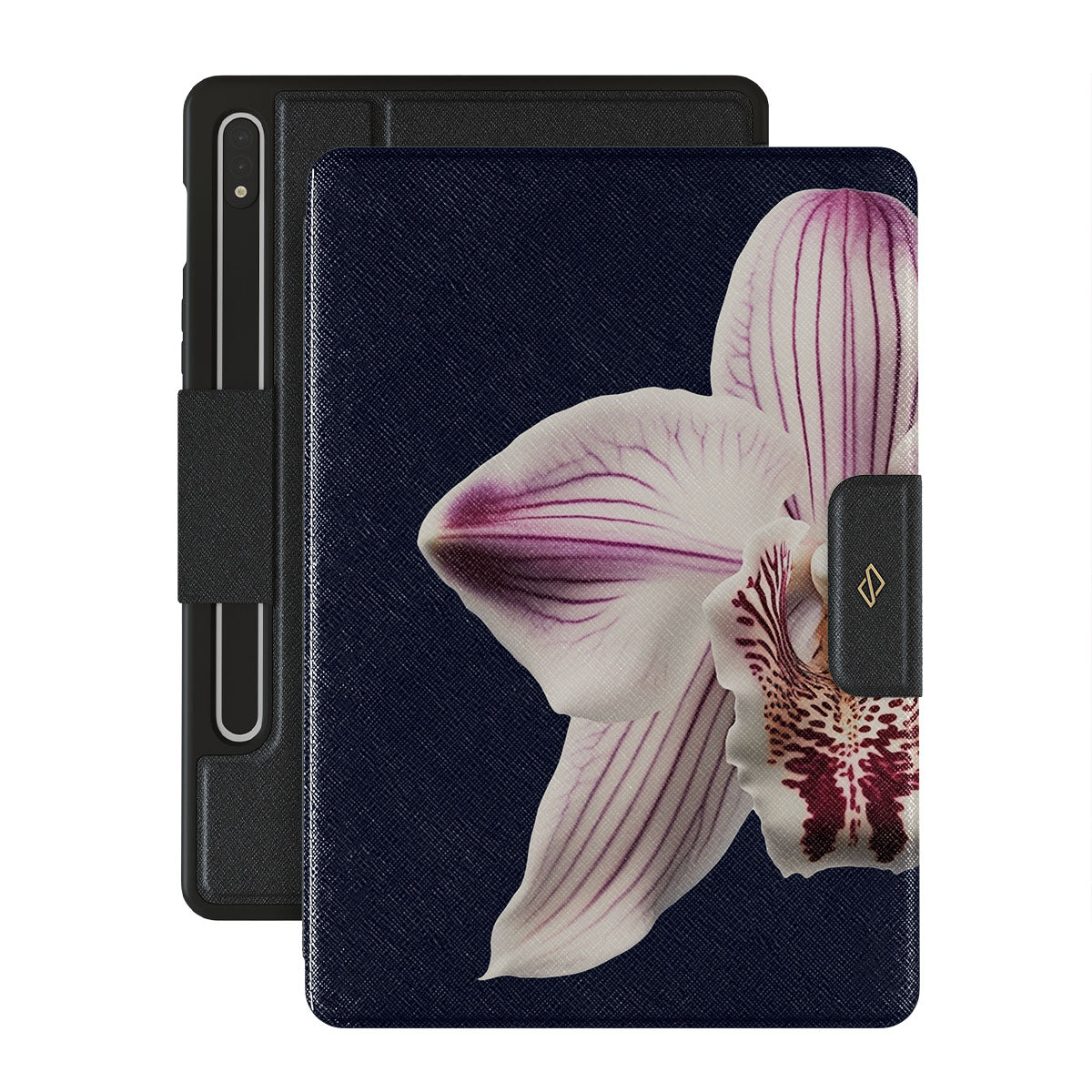 The white orchid blooms boldly upon a night sky blue, a beacon of clarity in the darkness. Our Nectar Samsung Galaxy Tab S10+ folio case design speaks to the soul's desire to find light within, to illuminate the hidden paths of self-discovery that only reveal themselves under the cloak of introspection.