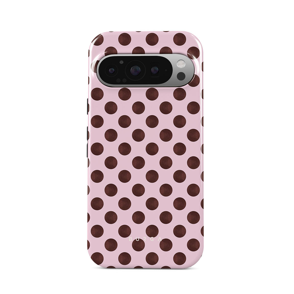 This design features: a retro polka dot pattern, pink background with brown polka dots.