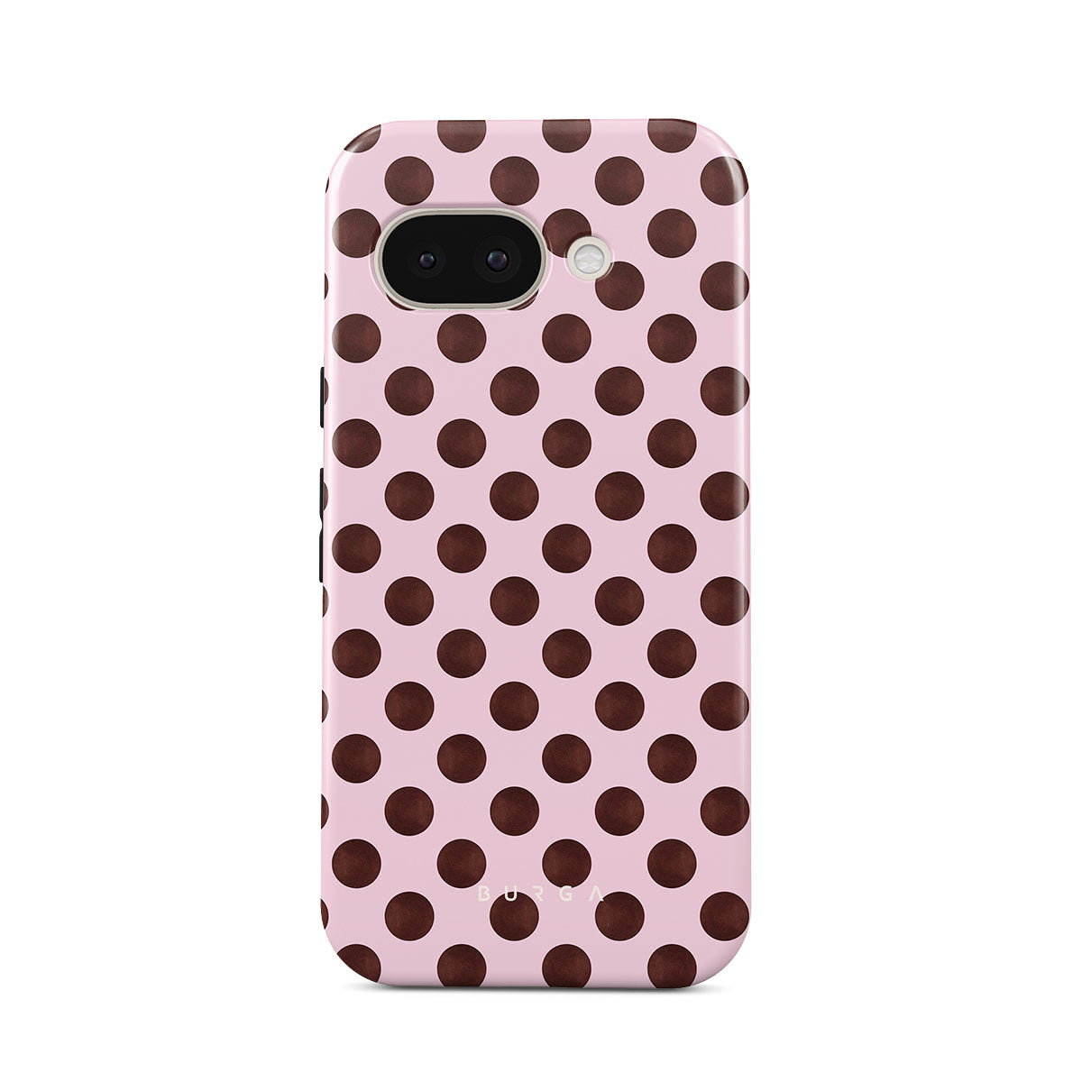 This design features: a retro polka dot pattern, pink background with brown polka dots.