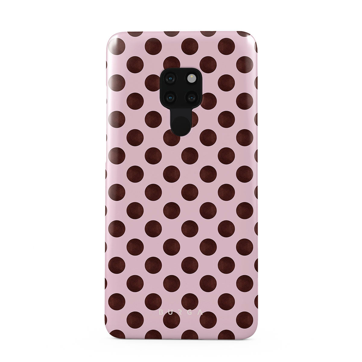 This design features: a retro polka dot pattern, pink background with brown polka dots.