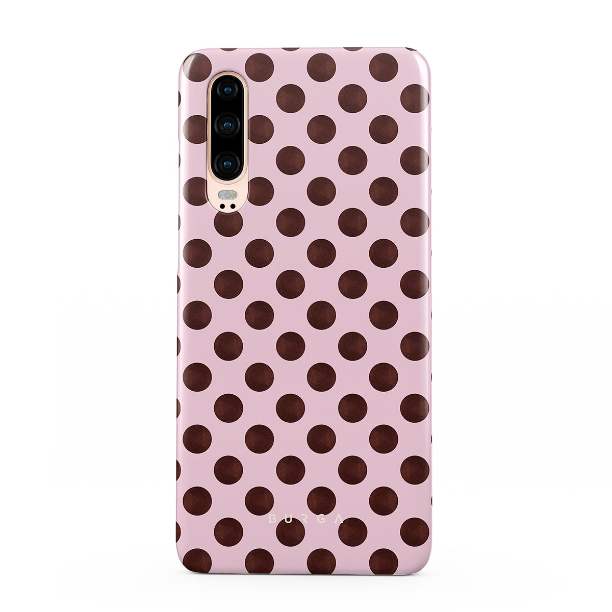 This design features: a retro polka dot pattern, pink background with brown polka dots.