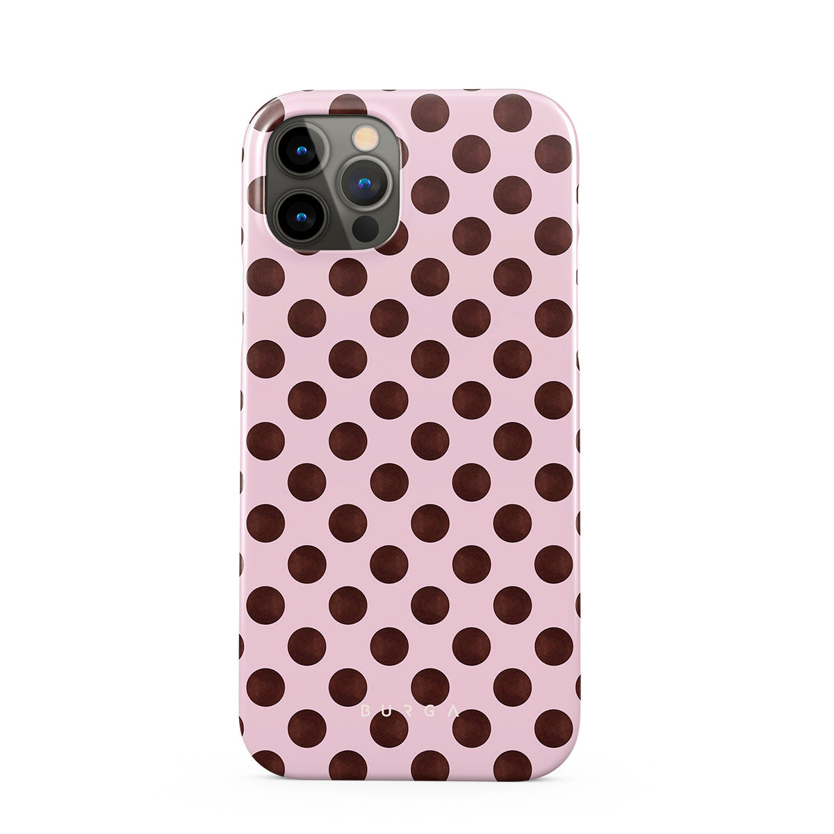 This design features: a retro polka dot pattern, pink background with brown polka dots.