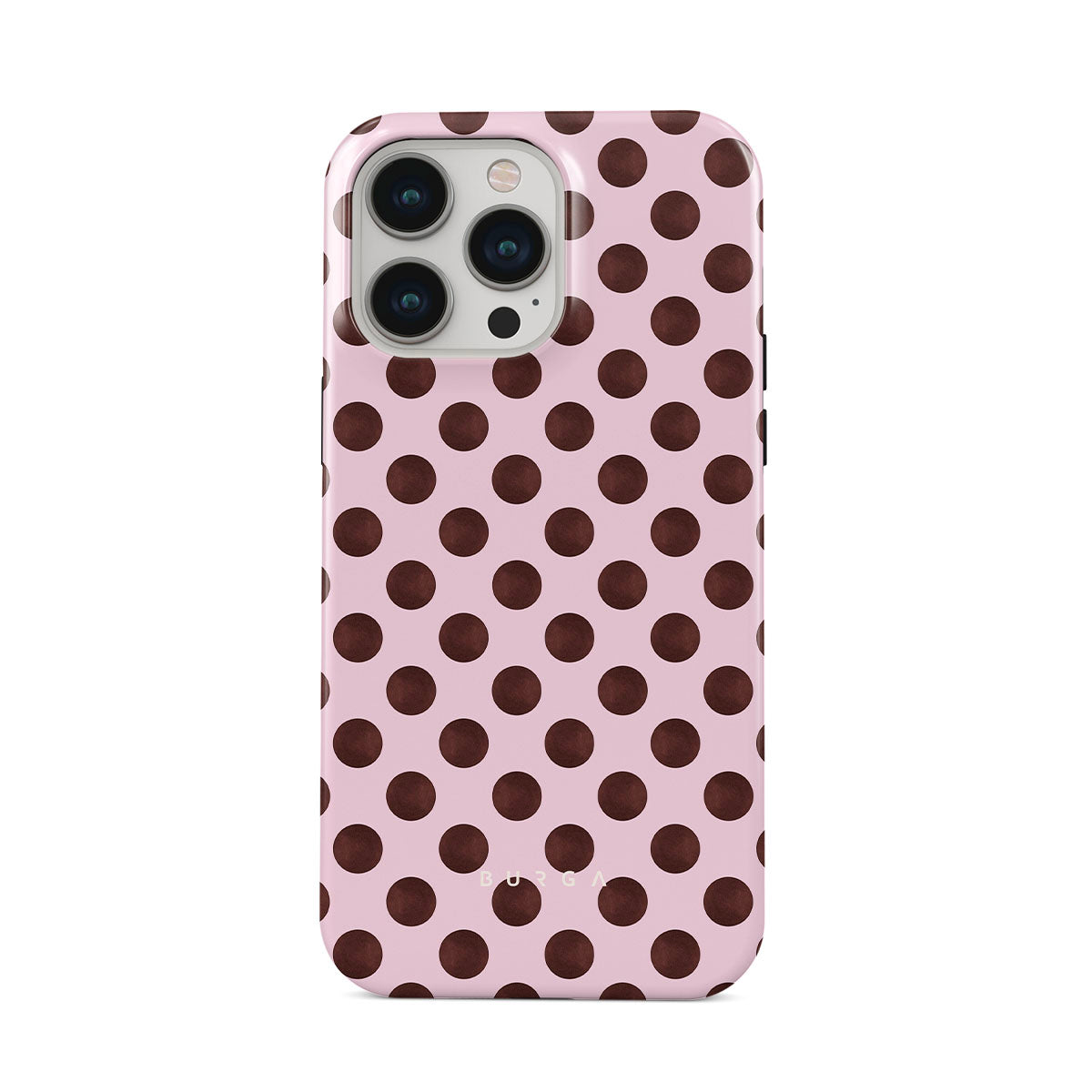This design features: a retro polka dot pattern, pink background with brown polka dots.