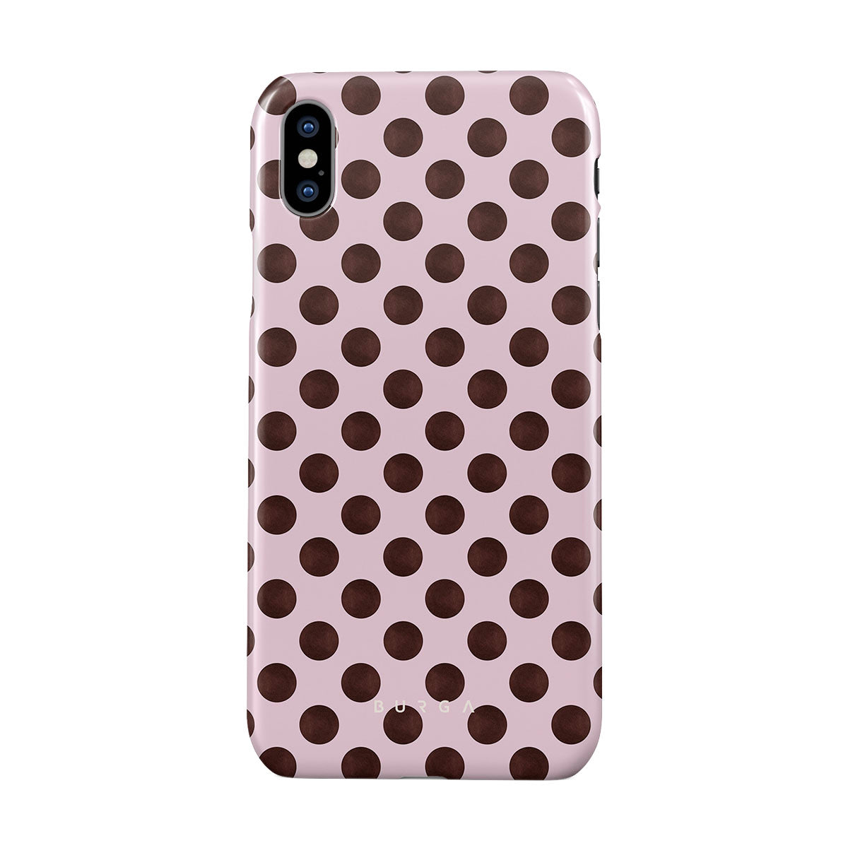 This design features: a retro polka dot pattern, pink background with brown polka dots.