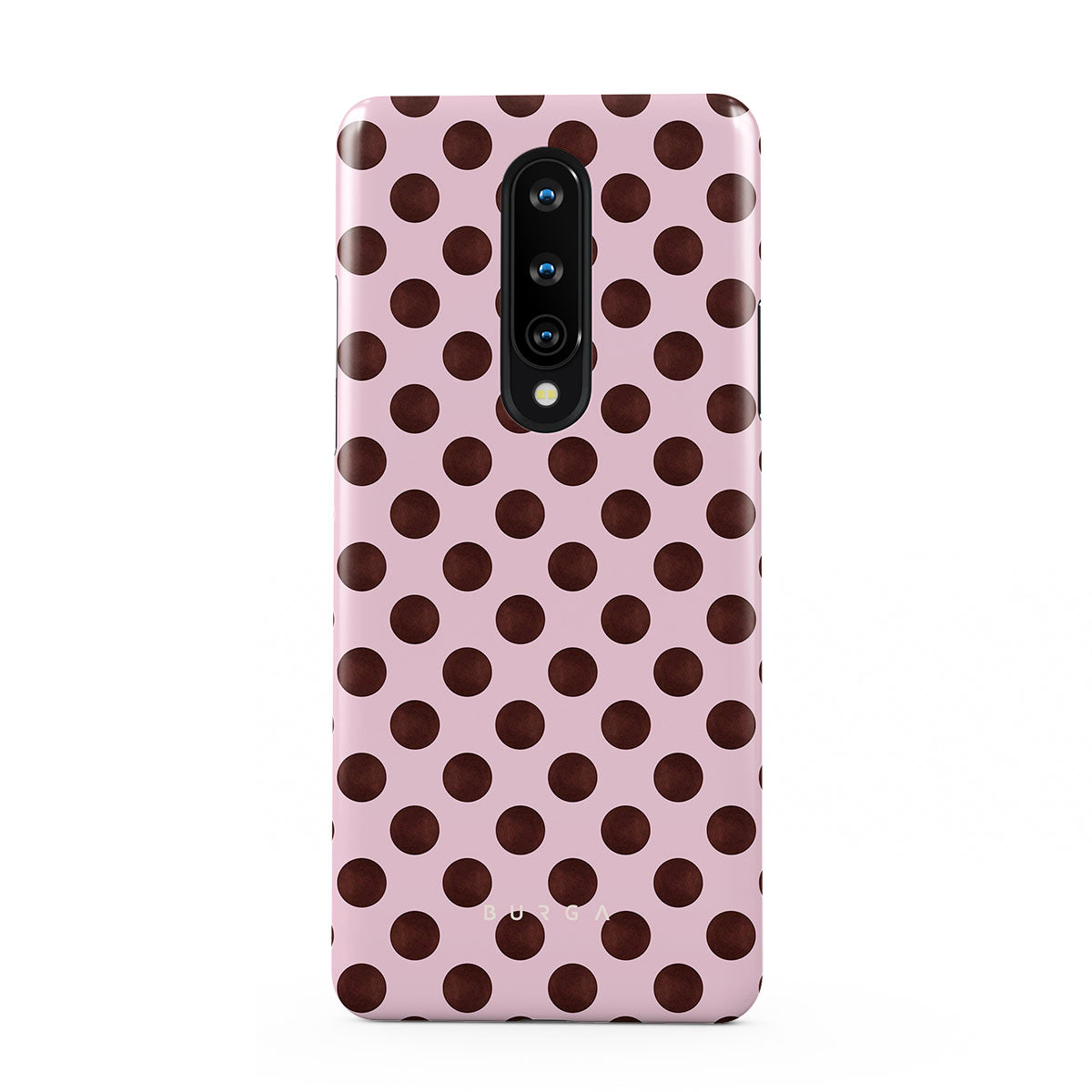 This design features: a retro polka dot pattern, pink background with brown polka dots.