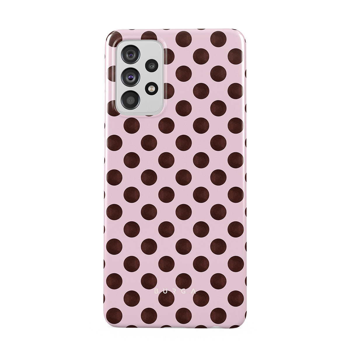 This design features: a retro polka dot pattern, pink background with brown polka dots.