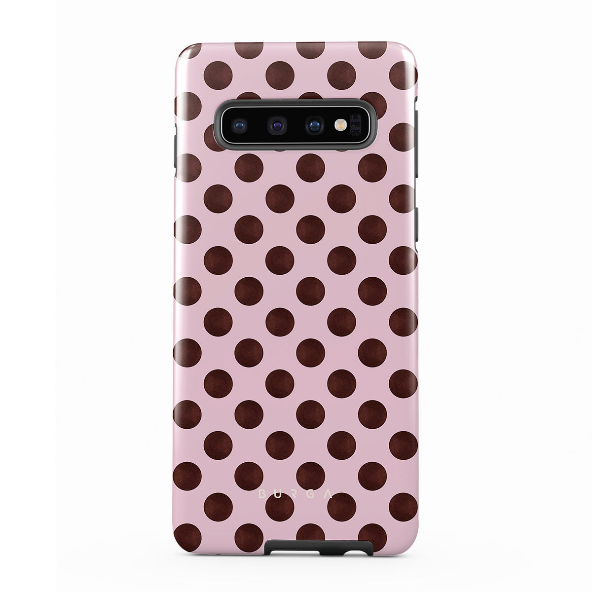 This design features: a retro polka dot pattern, pink background with brown polka dots.