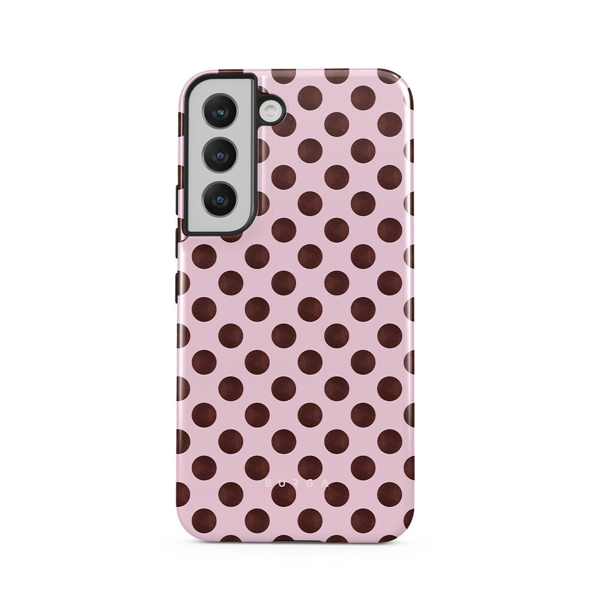 This design features: a retro polka dot pattern, pink background with brown polka dots.