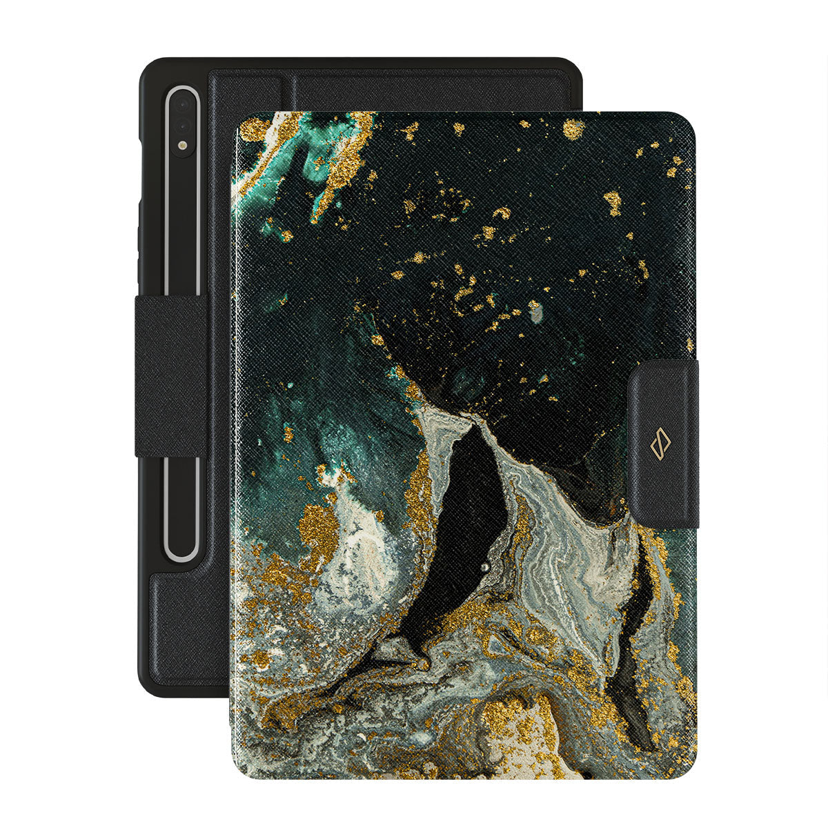 Our cute marble Northern Lights Samsung Galaxy Tab S9+ FE folio case showcases a combination of moss green shades in a marble pattern enriched with golden specks. The asymmetrical design reminding of a star map will add a touch of luxury and mystery to every accessory lover's collection.