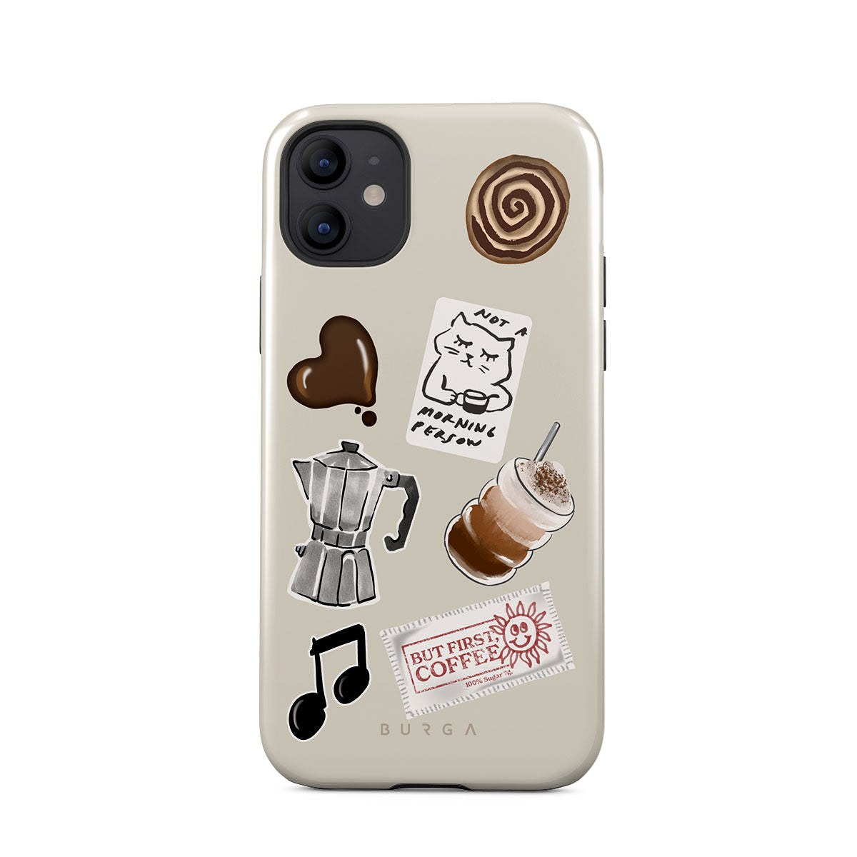 This design features: moka pot, frappe, cinnamon roll, chocolate heart, "Not a morning person" sticker, "But First, Coffee" receipt, music note