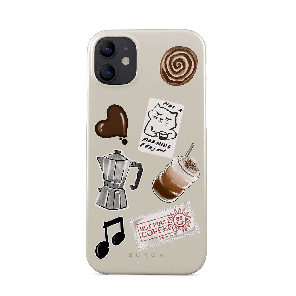 This design features: moka pot, frappe, cinnamon roll, chocolate heart, "Not a morning person" sticker, "But First, Coffee" receipt, music note