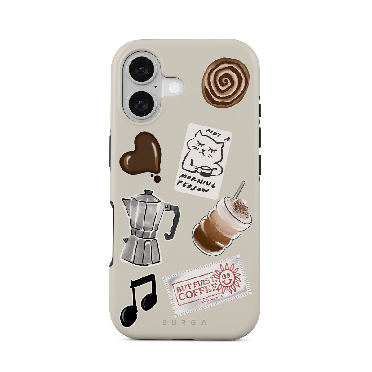 This design features: moka pot, frappe, cinnamon roll, chocolate heart, "Not a morning person" sticker, "But First, Coffee" receipt, music note