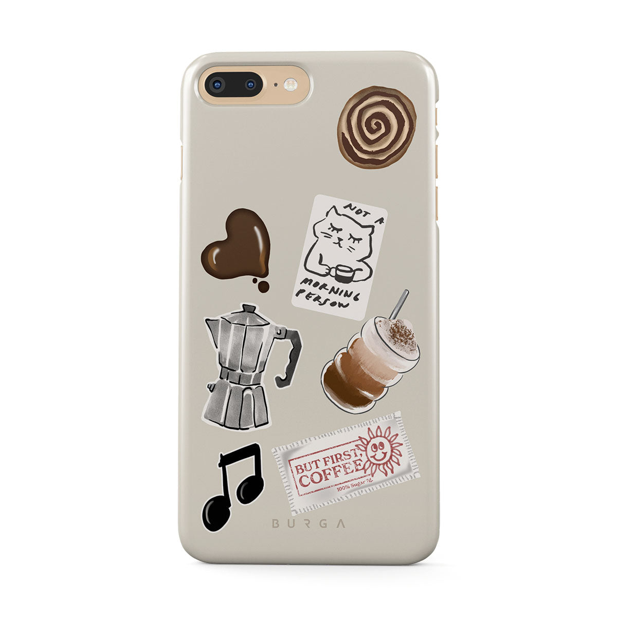 This design features: moka pot, frappe, cinnamon roll, chocolate heart, "Not a morning person" sticker, "But First, Coffee" receipt, music note